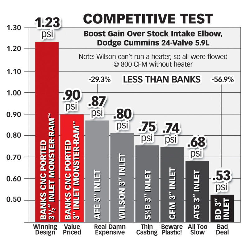 Monster-Ram raises boost without increasing backpressure at the turbine by Improving airflow from the intercooler. Result: a more responsive, fuel-efficient engine. Has six 1/8-inch NPT ports! Includes boost tube.The Banks Monster Ram is the highest performing Cummins Intake Elbow on the market, outflowing all competitors including our previous designs!